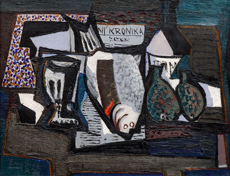 Довідка: Богуміл Кубішта (1884–1918) — один із чільних засновників чеського модерного живопису та руху чеського кубізму разом з Емілом Філлою (1882-1953), Антоніном Прокажкою (1882-1945) й іншими митцями угруповання «Osma». Помер у 1918 році під час епідемії «іспанки». Чеські медіа й організатори назвали продаж «винятковим аукціонним досягненням з продажу творів мистецтва такого жанру з 1989 року» та підкреслили, що результат закріпив інтерес колекціонерів до кубістичного періоду.Малюнок 2: Еміл Філла "Натюрморт з чашкою та двома рибками" (1930)