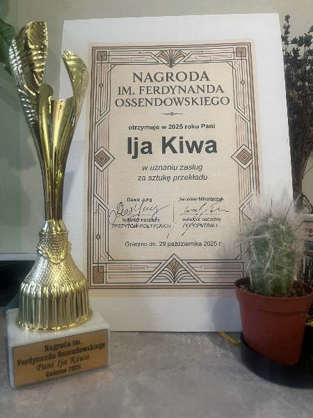 У Гнєзно, в філії Педагогічної бібліотеки в Познані відбулося вручення Премії імені Фердинанда Оссендовського українській поетесі, перекладачці та журналістці Ії Ківі. Церемонія пройшла в межах Фестивалю літератури Центрально-Східної Європи Endemity — події, покликаної розвивати культурний діалог між країнами регіону та представити найцікавіші постаті сучасної літератури. Високу відзнаку Ії Ківі вручили головні редактори польських культурних часописів — Давид Юнг, засновник премії та редактор журналу Zeszyty Poetyckie, і Ярослав Міколайчик, головний редактор видання Popcentrala. Як наголосили організатори, нагорода присуджується за видатні досягнення у галузі художнього перекладу та внесок у розвиток міжкультурного літературного діалогу.